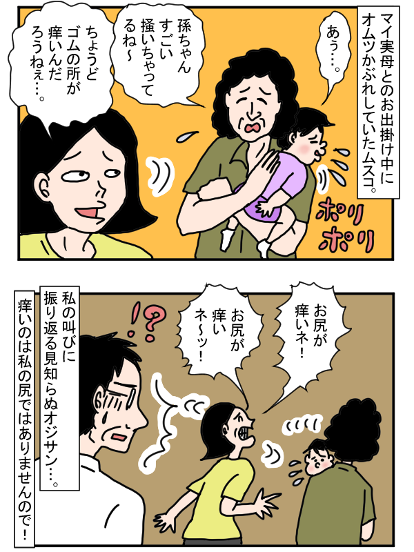 オムツかぶれで、お尻をしきりにかくムスコくん。辛そうな様子に、ワンタケさんが「お尻が痒いネ!」と声をかけていると、見知らぬおじさんが振り返ってきたのだそう…!「痒いのは私の尻ではありませんので!」と心の中で叫ぶワンタケさんでした。