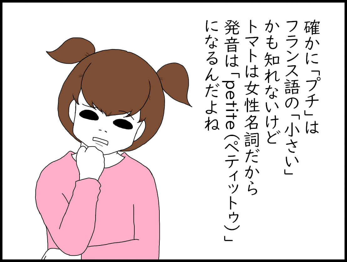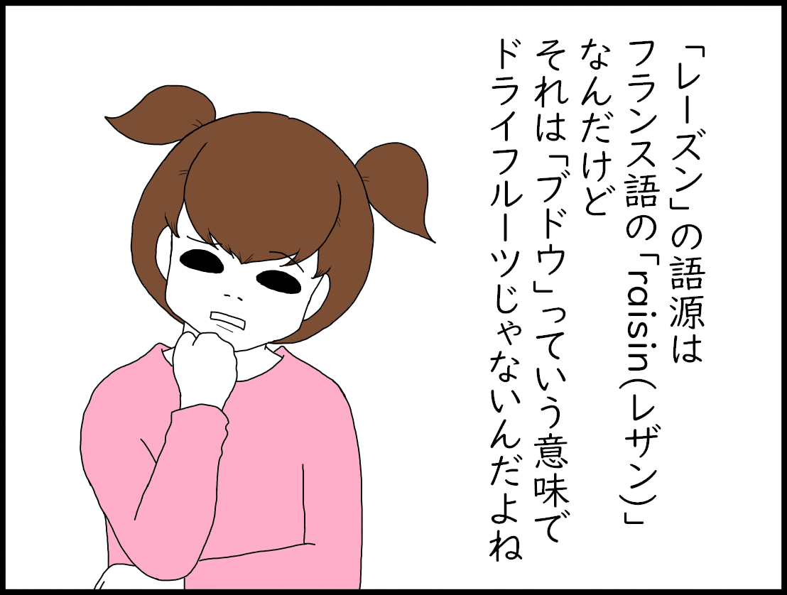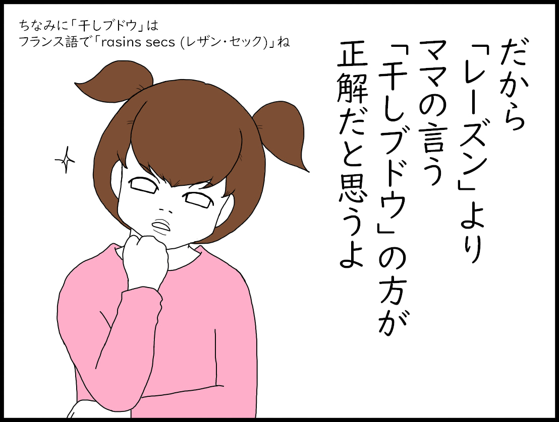 レーズンの語源はドライフルーツではない「ブドウ」を指すので、「干しぶどう」の方が適切ではないかと言うチハナちゃん。さらに、プチトマトの「プチ」についても解説。しかし、「カルキ」については全く知らなかったのでした…。