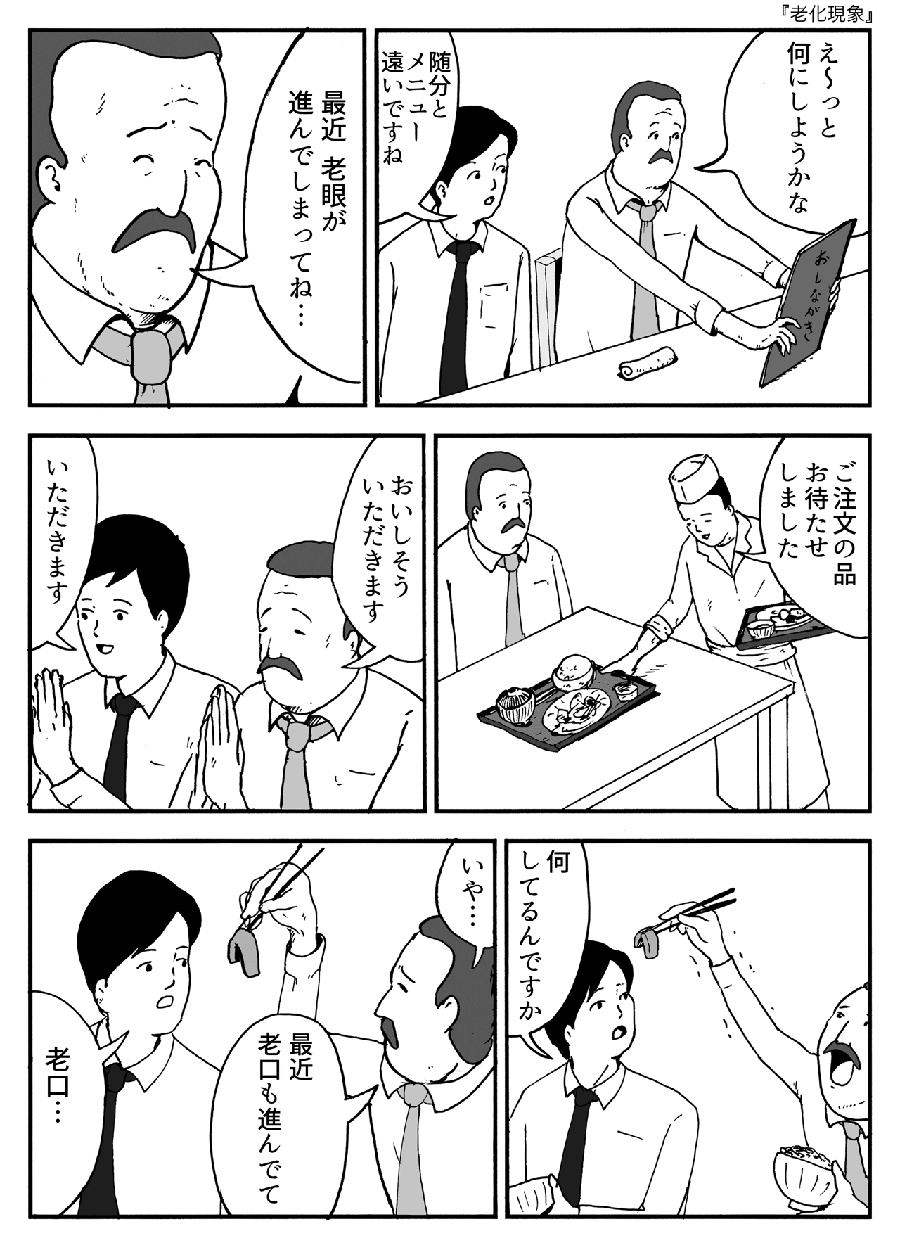 「随分とメニュー遠いですね」と部下に指摘された主人公は、「最近老眼が進んでしまってね…」とわけを話します。その後、注文の品がやってくると、主人公は箸を口からやけに遠ざけて食べようとしています。部下が「何してるんですか」と聞くと、主人公は「いや…最近老口も進んでて」と答えるのでした!
