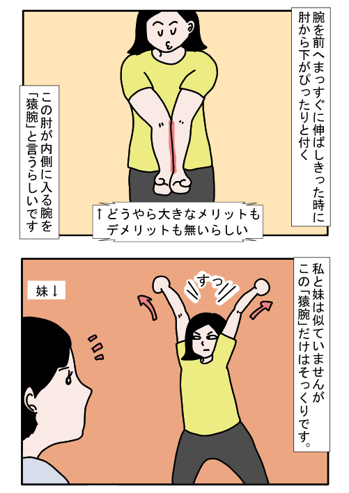 腕を真っ直ぐ伸ばしきった時に、肘から下がぴったりと付く「猿腕」。ワンタケさん姉妹は2人とも猿腕だそうで…?
