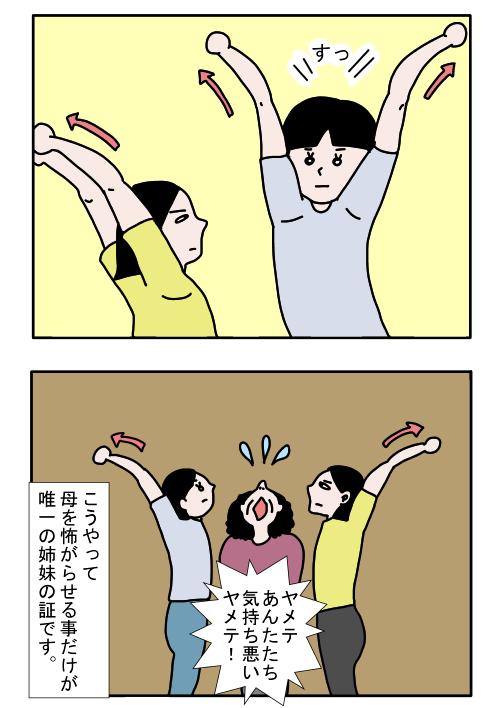 2人で伸びをしている姿は、確かにシュールで怖いです…。お母さんが止めに入る気持ちもわかります。顔は似ていなくても、骨格は似ているのですね! 腕を伸ばす2人の真剣な表情に、思わずくすりと笑ってしまいます。