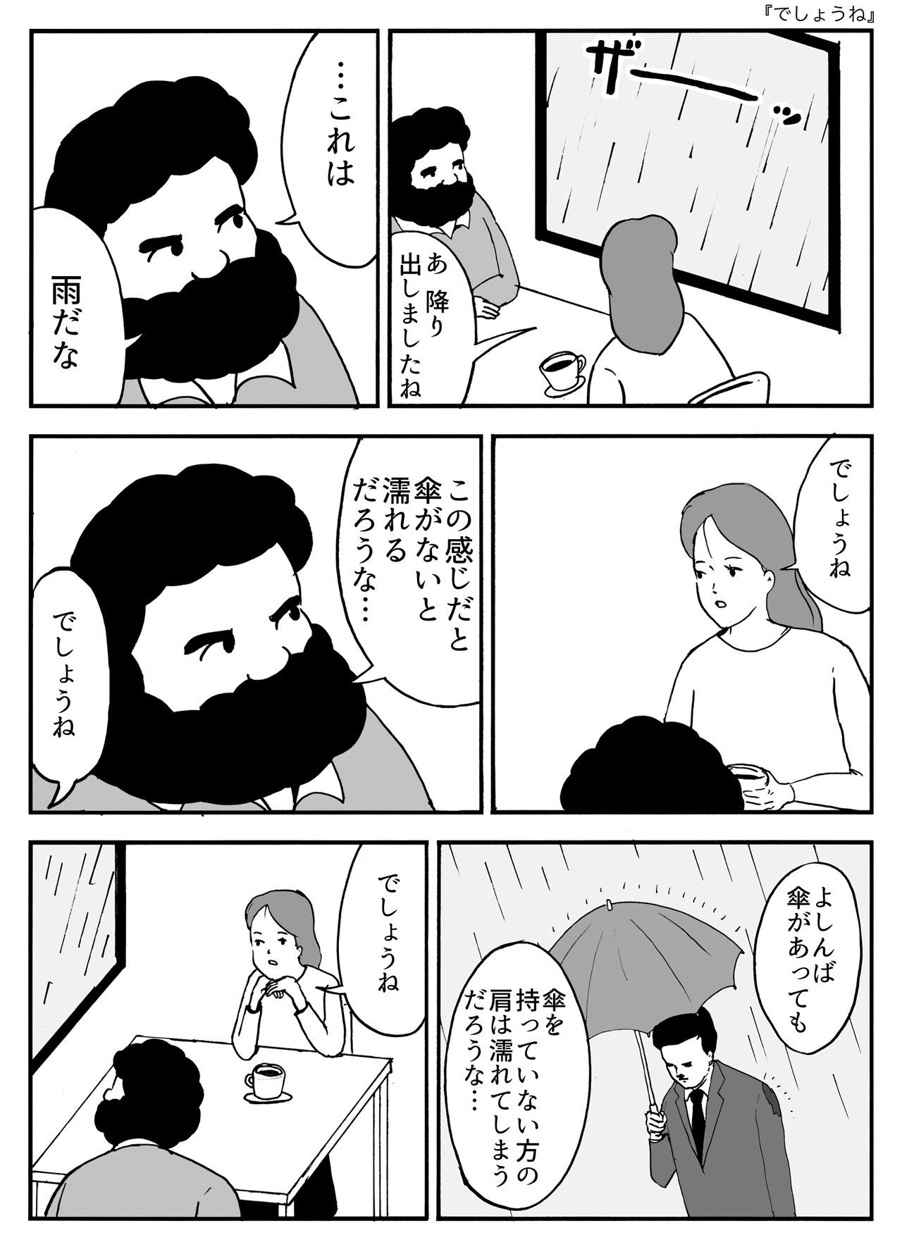 そして男性がさらに「よしんば傘があっても 傘を持っていない方の肩は濡れてしまうだろうな…」と重ねると、女性はやっぱり「でしょうね」と返すのでした…。