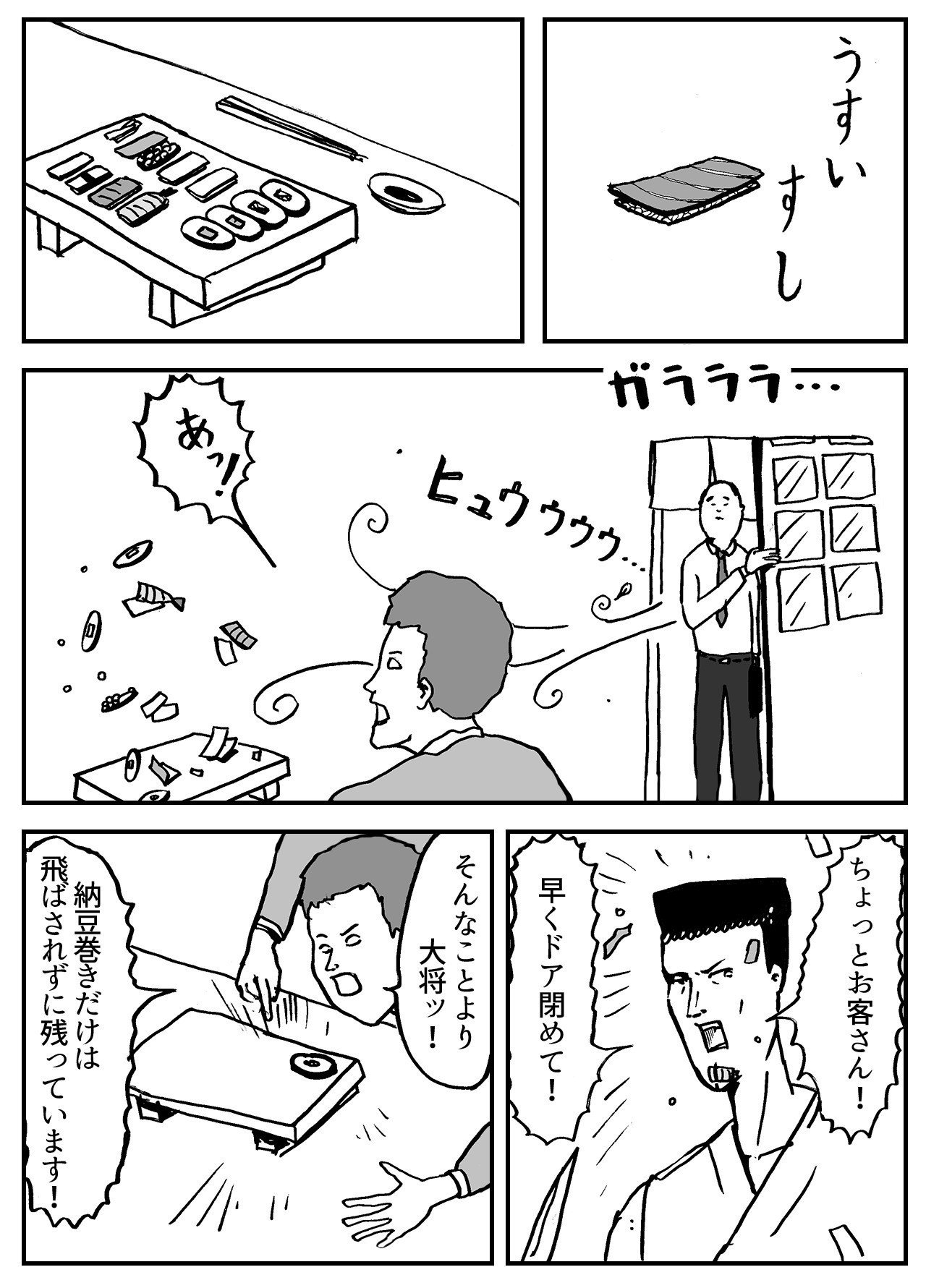 大将は「ちょっとお客さん! 早くドア閉めて!」と声を荒げます。寿司を食べようとしていたお客は「そんなことより大将ッ! 納豆巻きだけは飛ばされずに残っています!」と叫ぶのでした!