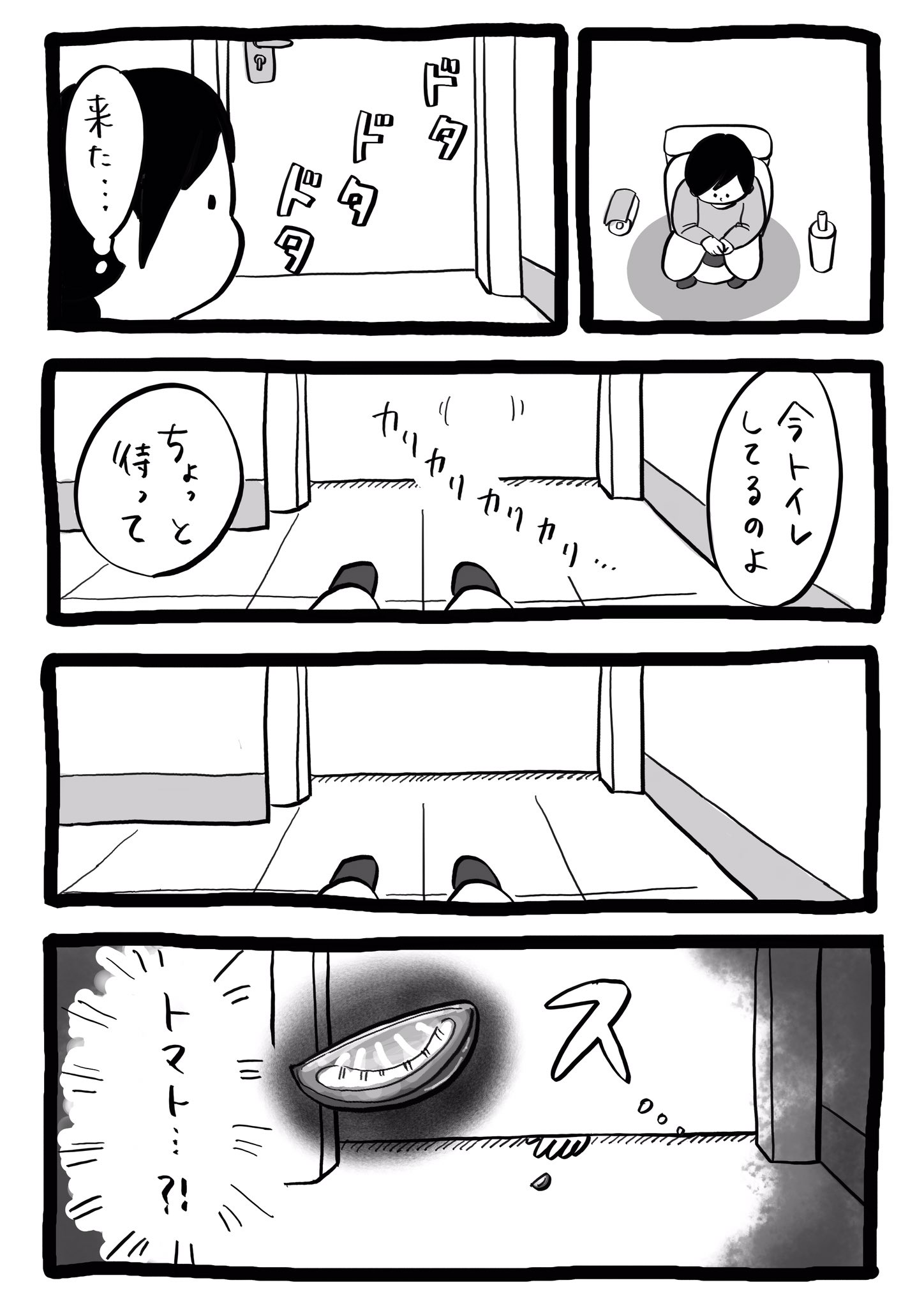 息子さんが自分を追いかけてきたことに気付いたしばひろさんは、「ちょっと待って」と声をかけました。一旦静かになったと思いきや、今度はドア下の隙間からトマトが差し込まれてきたのでした…。