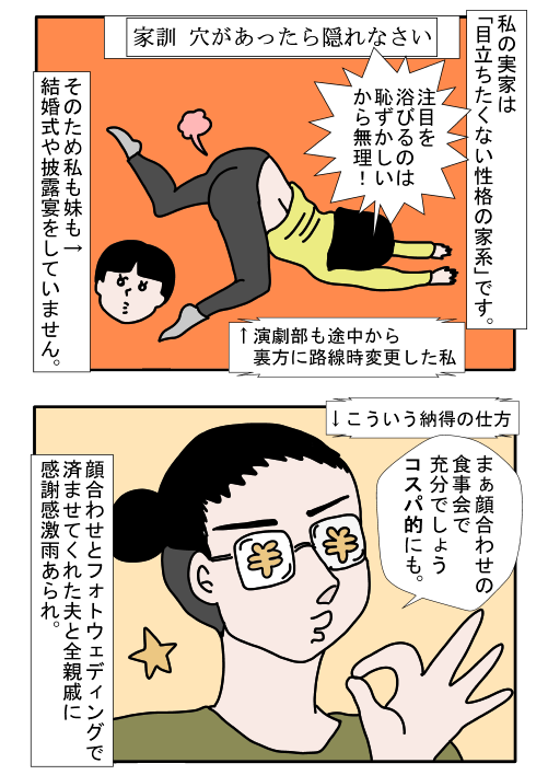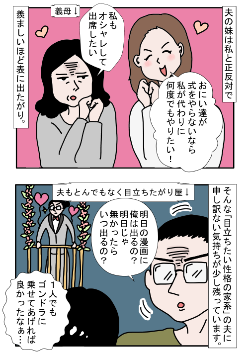 そのため、ワンタケさんも妹さんも結婚式や披露宴をしていないのだそう。顔合わせとフォトウエディングで済ませてくれた、夫と全親戚に感謝しているワンタケさん。「目立ちたい性格の家系」の夫に「1人でもゴンドラに乗せてあげればよかったなぁ…」と、申し訳ない気持ちになるのでした。