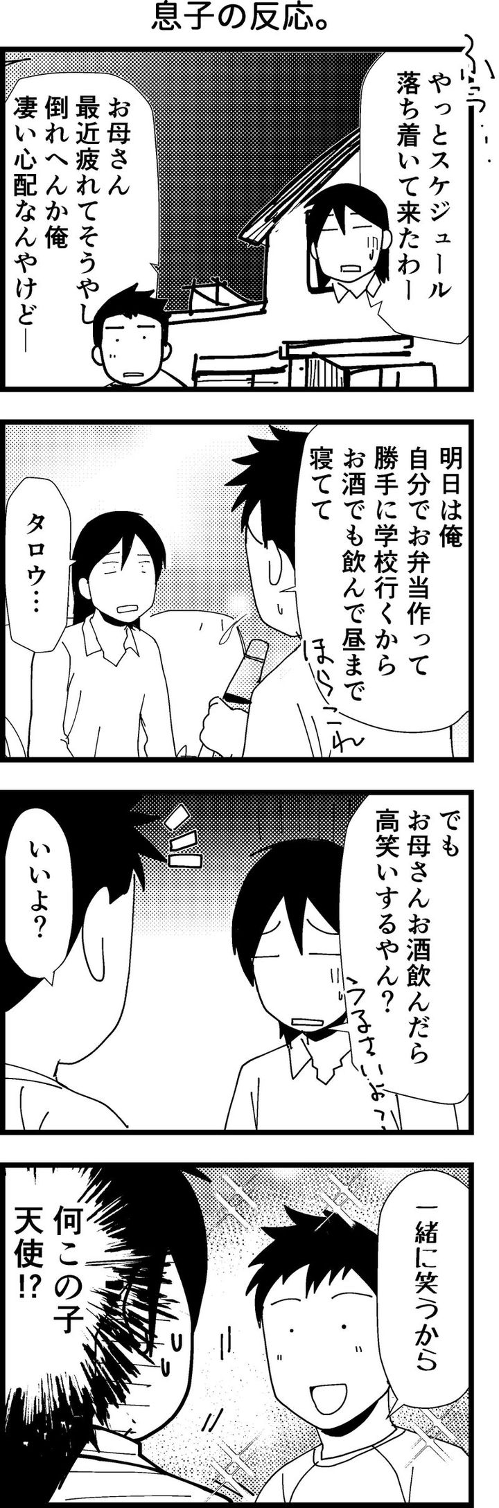 仕事で疲れ気味なはるたけめぐみさん。心配したタロウくんは、「明日は俺自分でお弁当作って勝手に学校行くからお酒でも飲んで昼まで寝てて」と労ってくれます。酒を飲むと高笑いしてしまうはるたけめぐみさんは、「うるさいよ?」と尋ねます。それでも、「いいよ?一緒に笑うから」と受け入れてくれるタロウくんでした。