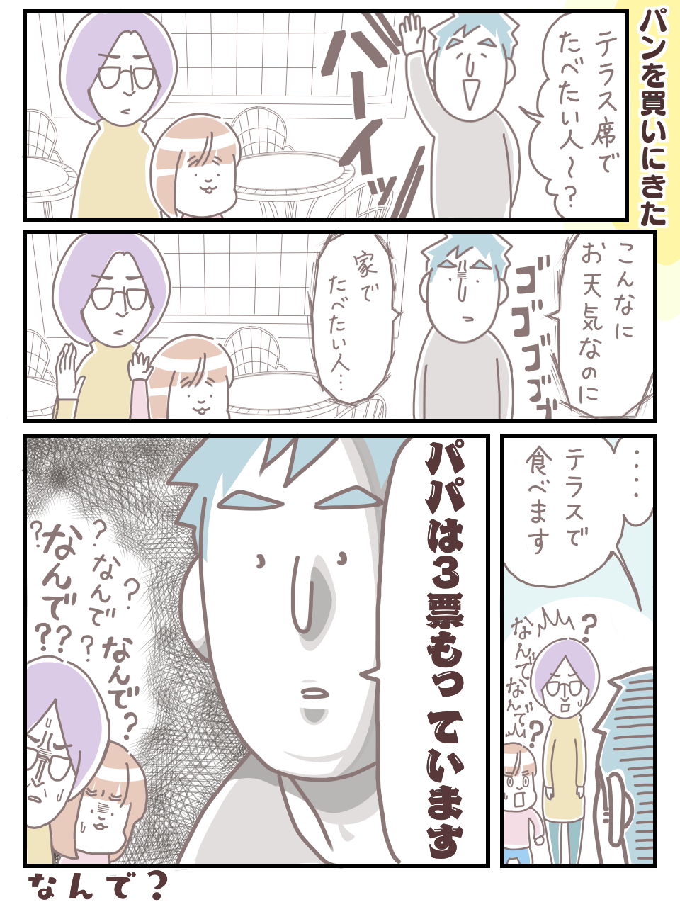 つぶらな瞳で、3票持っている宣言をするパパの表情が面白いです!「なんで?なんで?」と戸惑いながらも、最後にはテラス席で食事を楽しむことにした、きさらぎさんとぽんちゃんのやさしさも伝わってきます。