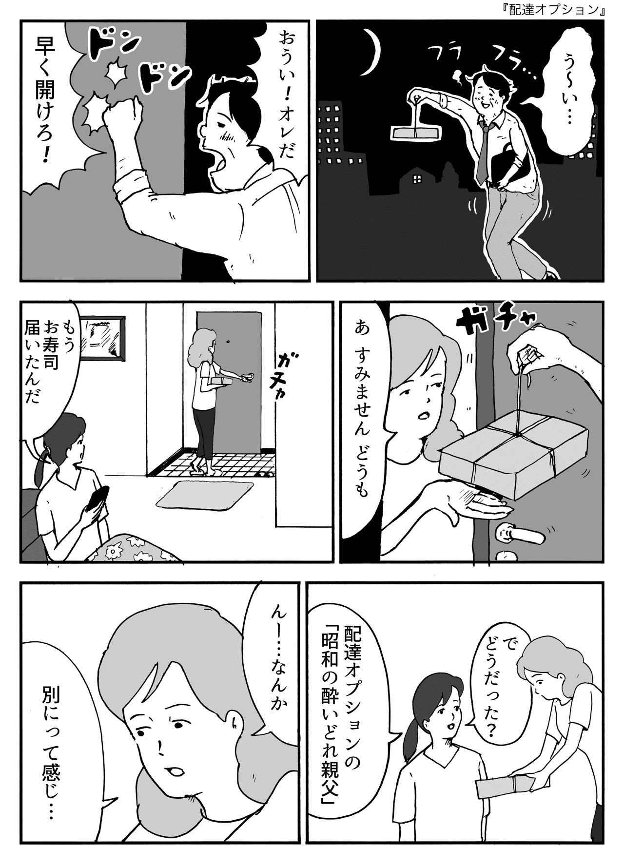 「おうい!オレだ 早く開けろ!」と言いながら、男性はドアをドンドン叩いています。すると、中から出てきた女性は「あ すみません どうも」とクールに言いながら、寿司折を受け取ってドアを閉めてしまいました。