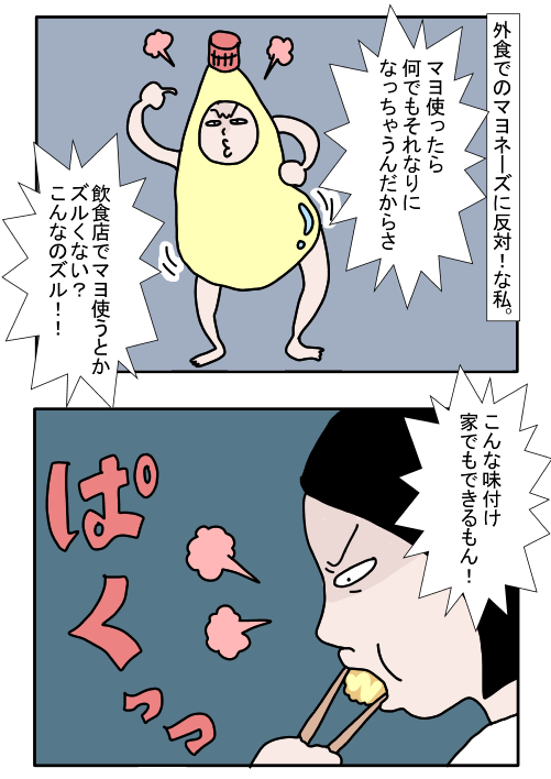 ワンタケさんの言い分は「マヨ使ったら何でもそれなりになっちゃうんだからさ」「こんな味付け家でもできるもん!」というものでした。