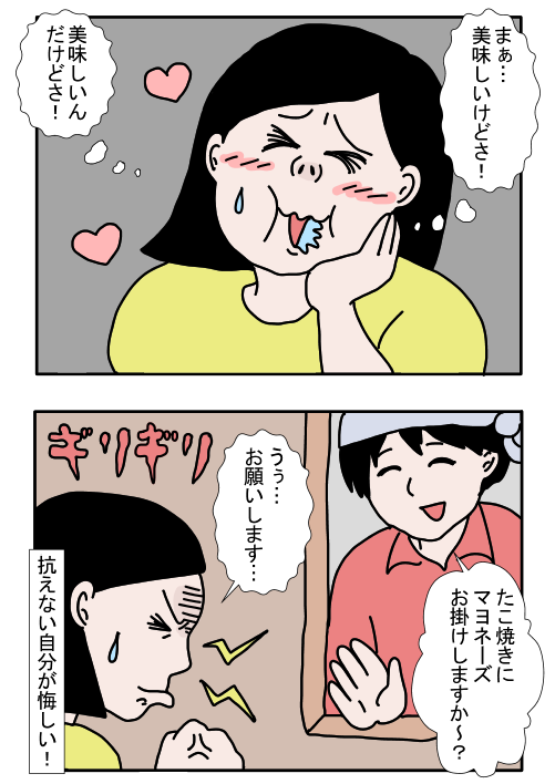 とはいえ、マヨネーズをつけた食べ物の美味しさには抗えません。たこ焼きを買うときに「マヨネーズお掛けしますか〜?」と聞かれると、悔しさに歯軋りしながらも「うぅ…お願いします…」と答えるのでした!