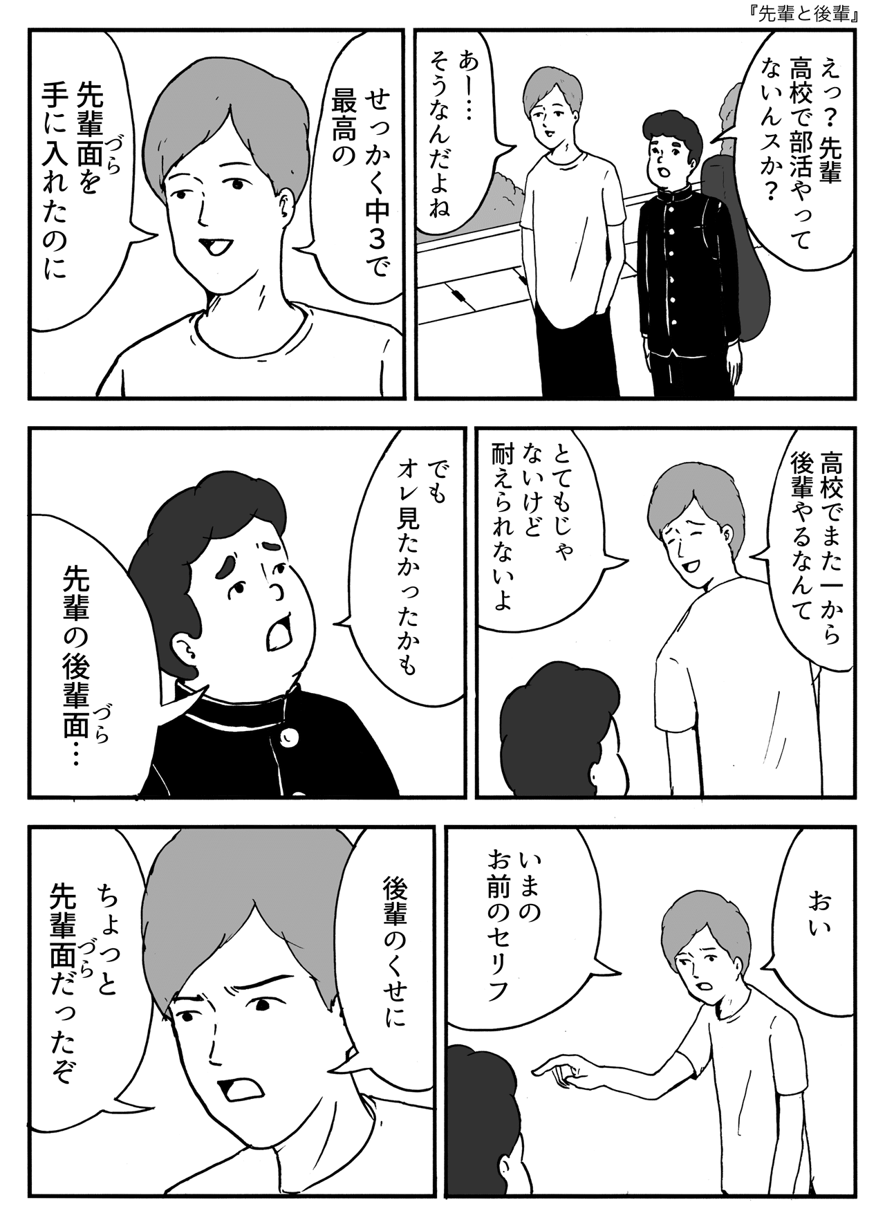 「先輩面」はよく聞く言葉ですが、「後輩面」という耳慣れない響きがおかしいですね! 後輩のセリフはかわいい甘えのようにも思いますが、これを先輩面と感じる主人公は、かなり厳しい先輩だったようですね…。