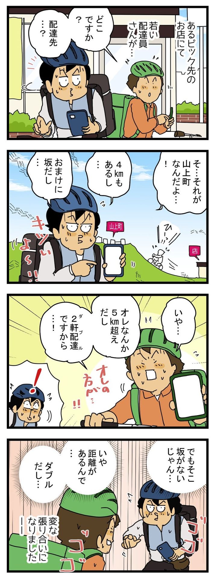 若い配達員は5キロメートル超えで2軒配達だと、オレの方がキツイと言わんばかりのアピールをしてきます。ゆきたこーすけさんの対抗心にも火がついたようで、「でもそこ坂がないじゃん…」と返すも、さらに距離と配達軒数を引き合いに出され、変な張り合いが勃発したのでした…。