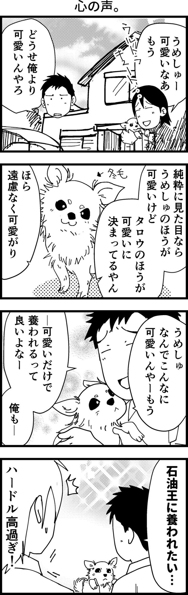 自分よりもうめしゅが可愛がられているところを見て、嫉妬してしまうタロウくんが可愛らしいですね。確かに、可愛いだけで養ってもらえるのは羨ましいですが、石油王に養ってもらうとなると、実現は難しいでしょう…。