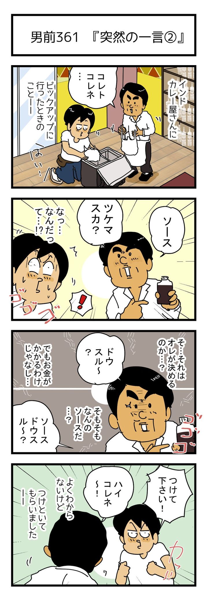 フードデリバリーサービスの仕事で、インドカレー屋に商品をピックアップにしに行ったゆきたこーすけさん。商品をデリバリーボックスに詰めていると、店員が突然、「ソース ツケマスカ?」と声をかけてきました。