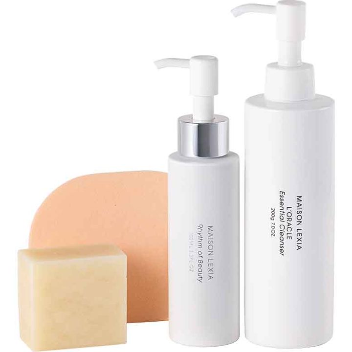 <セット内容>右から:リズム オブ ビューティー(スポンジ付き)100ml、オラクルエッセンシャル クレンザー 200g、ボディ&ハンドソープ ピュリティカーム 80g