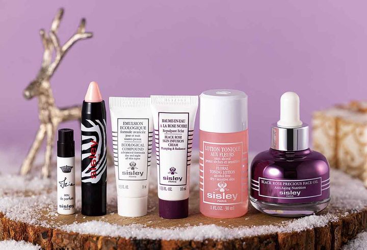 <セット内容>右から:ブラックローズ プレシャスオイル 25ml、フローラルトニックローション 30ml、ブラックローズ スキンクリーム、エコロジカル コムパウンド アドバンスト 各10ml、フィトリップ ツイスト No.16 バーム ミニサイズ、イジィア 1.4ml