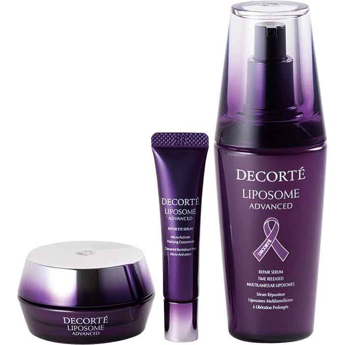 <セット内容>右から:リポソーム アドバンスト リペアセラム 75ml、同 リペアアイセラム 8ml、同 リペアクリーム 20g