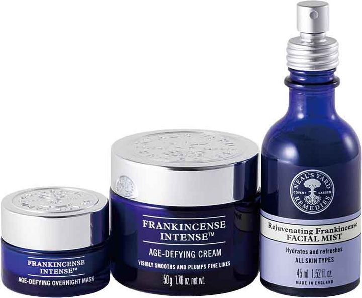 <セット内容>右から:フランキンセンス ハイドレイティング フェイシャルミスト 45ml、同 インテンスクリーム 50g、同 インテンススリーピングマスク15ml