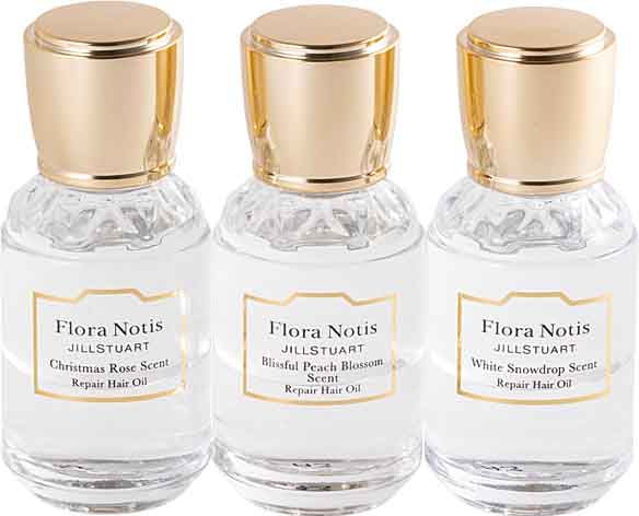 <セット内容>右から:フローラノーティス ジルスチュアート ホワイトスノードロップ リペアヘアオイル、ブリスフルピーチブロッサム リペアヘアオイル、クリスマスローズ リペアヘアオイル 各20ml