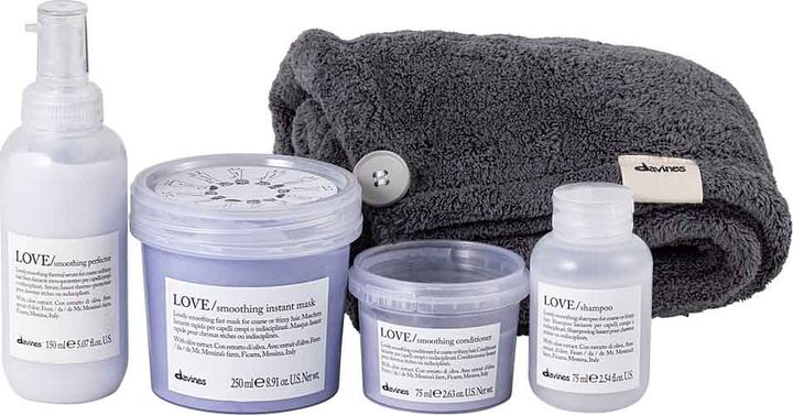 <セット内容>右から:ダヴィネスエッセンシャル ラブ シャンプー、同コンディショナー 各75ml、同 インスタント ヘアマスク 250ml、同 スムージング ミルク 150ml、ヘアタオル(H280×W700mm)