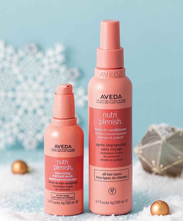 ドライヤーやヘアアイロン、紫外線などによる乾燥から髪を守り、柔らかく扱いやすい髪へと仕上げる98%自然界由来成分の日中用の洗い流さないトリートメントと、寝ている間に髪の内部まで浸透し、深い潤いで翌朝しっとりヘアに導く夜用美容液のセット。