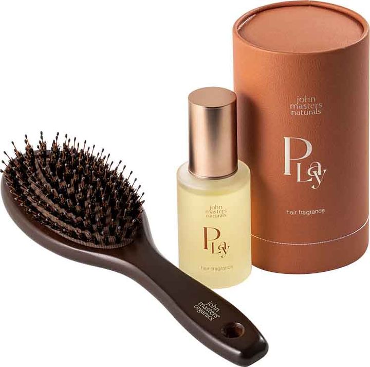 <セット内容>右から:ヘアフレグランス「play」 58ml、コンボパドルブラシ