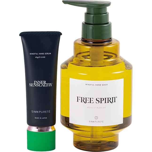 <セット内容>右から:マインドフル ハンドウォッシュ FREE SPIRIT 480ml、マインドフル ハンドセラム INNER SENSUALITY 45g