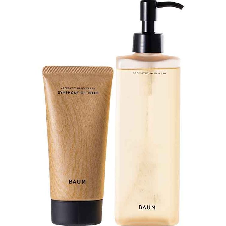 <セット内容>右から:バウム アロマティック ハンドウォッシュ 300ml、同ハンドクリーム(Sサイズ)3(シンフォニー オブ ツリー)75g