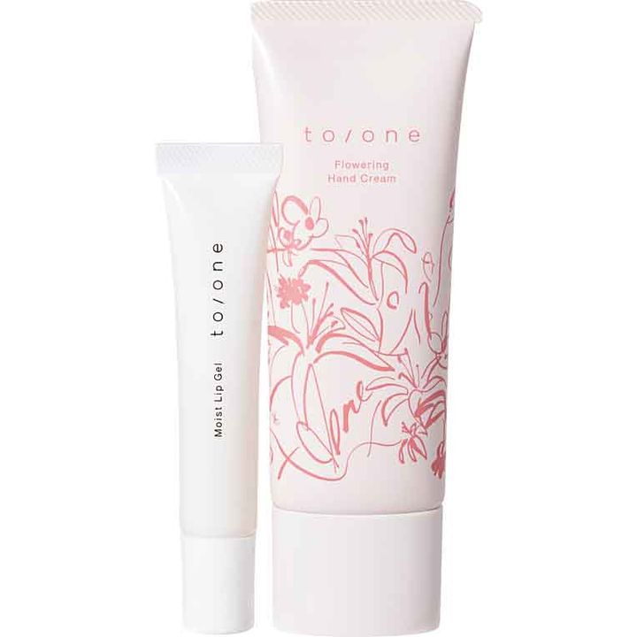 <セット内容>右から:トーン フラワリング ハンドクリーム 40g、トーン モイスト リップジェル 8g(共にディライトフィルブーケの香り)