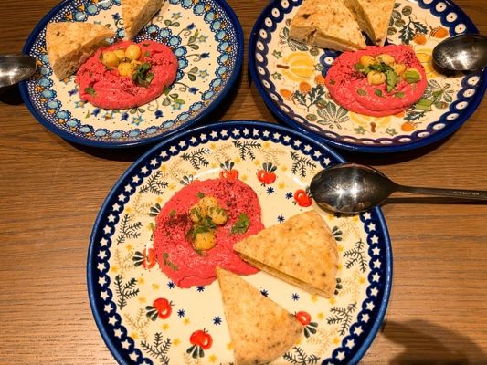 3人前。それぞれ皿のデザインが違い素敵!デーツ入りフムスは初めて!ピンクがかわいい。優しい味でさっぱりめ、おいしい。ひよこ豆がのっていて、ほくほく。ピタブレッドは2センチくらい厚みがあり。