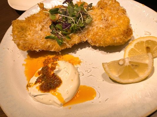 レモンをたっぷり絞るので、さっぱり。カツレツはカリッと中のお肉はしっとり。胸肉とは思えないおいしさ。カツにサワークリームを合わせるのも初めて!以前流行ったアリッサ(ピリ辛ソース)が軽くピリッとしていいアクセント。