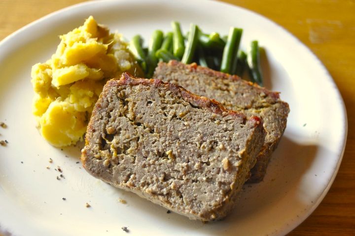 3、(2)をサツマイモと共に180℃に予熱したオーブンで30分焼く。上面が焦げないようにアルミホイルで覆い、さらに20分焼く。竹串で刺し、ミートローフは肉汁が透き通っていることを確認する。サツマイモはかたければさらに焼いて火を通す。