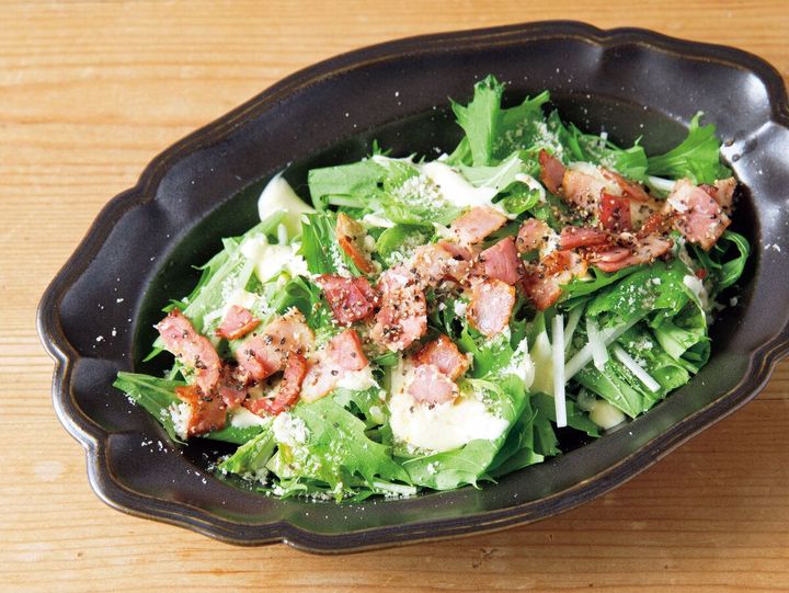 (2)ボールにマヨネーズ大さじ2を入れ、(1)のフライパンに残った調味料を加えて混ぜる。(1)の水菜に回しかけてベーコンを散らし、粉チーズと粗びき黒こしょう少々をふる。