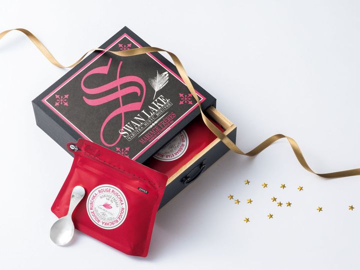 箱を開けるとチャイコフスキーの名曲「白鳥の湖」が流れるオルゴールBOXの中に、ロシア風ブレンドティー5種と茶さじがイン。