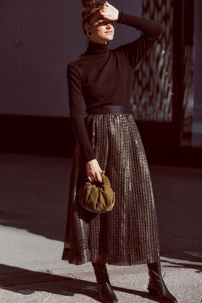 黒ベースのスタイリングをドレスライクに引き寄せるゴールドラメのスカートを主役に。シンプルな黒タートルにエレガントな迫力が備わり、肩ひじ張らず上品なイメージへ引き上がる。ギャザー入りのドライなバッグで緩急をつけつつ、ゴールドが浮かないよう色を拾う役割も。