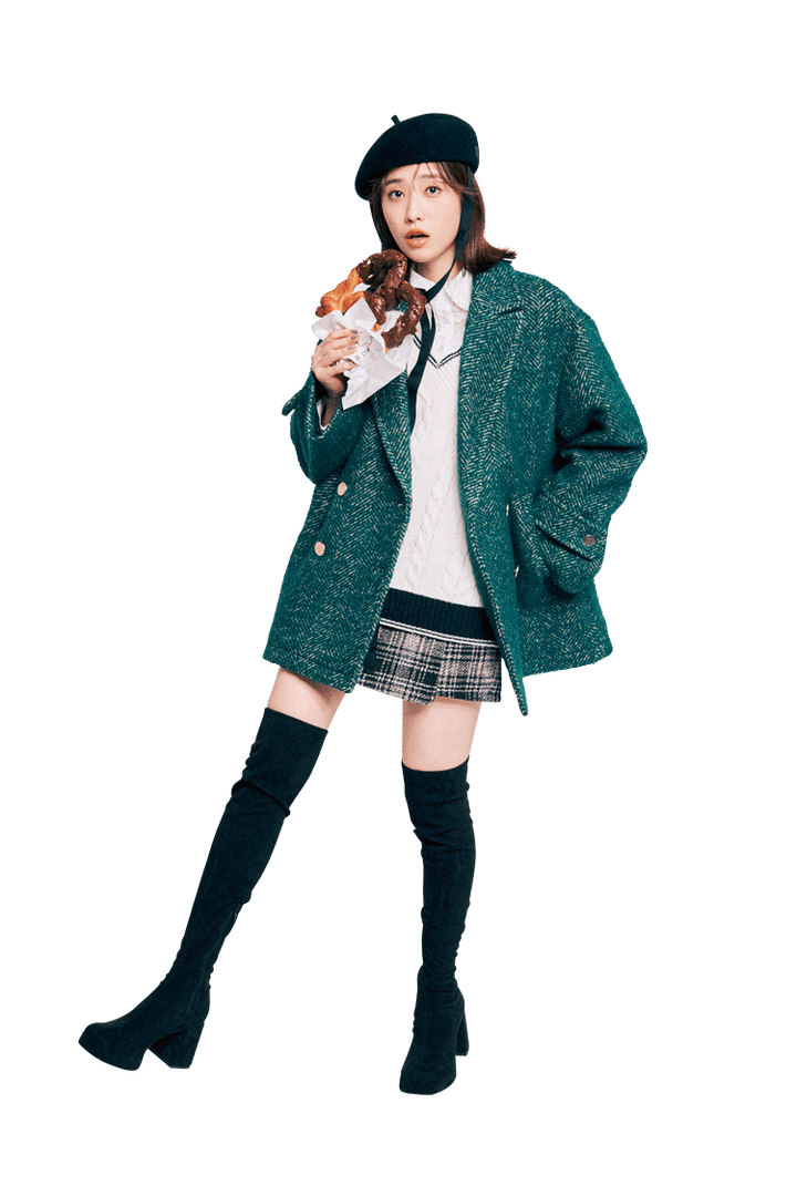 グリーンツイードコート 27,500円/レイ ビームス、ニットベスト 22,000円/フレッドペリー×レイ ビームス(ともにレイ ビームス 新宿) 白フリルブラウス 11,800円/Treat Ürself キュロットパンツ 13,530円/SNIDEL ベレー帽 33,000円/arth(OVERRIDE 神宮前店) ニーハイブーツ 15,900円/チャールズ&キース(チャールズ&キース ジャパン)