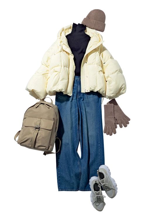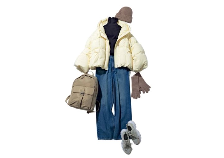 ダウンジャケット¥35,200/FRAY I.D ルミネ新宿2店、タートルニット¥2,990/UNIQLO、デニムパンツ¥8,910/ギャレスト(ワールド)、リュックサック¥6,590/ZARA(ザラ)、スニーカー¥8,800/ORTR( ダブルエー)、ニット帽¥990/GU、手袋¥1,490/GU