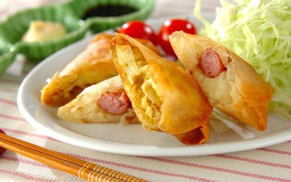 マッシュポテト、ソーセージ、チーズを包むアイディア春巻きです。マッシュポテトの半量にカレー粉を混ぜ、2種類の味わいを楽しめます。子どもが大好きな組み合わせで、手軽に作れるのがポイント。おかずにもおつまみにもぴったりです。