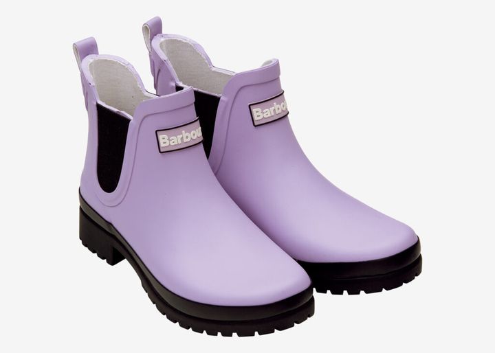 雨の日の外出を楽しみに変えてくれるパープルのレインブーツは、1894年創業の英国ブランド〈バブアー〉から。クッション性に優れたインソールにより長時間履いても疲れにくく、サイドゴア仕様で着脱もしやすい。かわいさがありつつも、黒のソールが引き締め役になり、大人な雰囲気をキープ。ダークトーンになりがちな冬の着こなしの差し色としても重宝する。