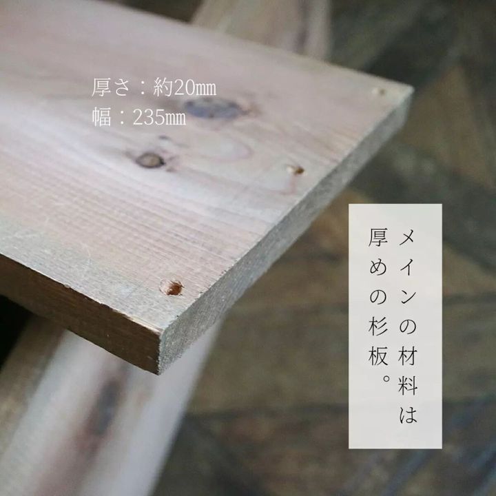 材料として厚さ20mm、幅235mmの杉板を準備しました。杉板は柔らかく、加工が簡単なので、DIYにもってこいの木材なんですよ。もちろん他の木材を使っても構いません。棚板用に710mmを3枚、側面用に500mmを2枚カットしましょう。