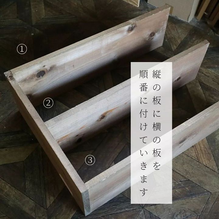 それでは組み立てていきます。側面の板に棚板を3枚、写真のような形になるように付けていきます。上下は側面の板の端に合わせた場所、残りの1枚は真ん中の位置に付けましょう。