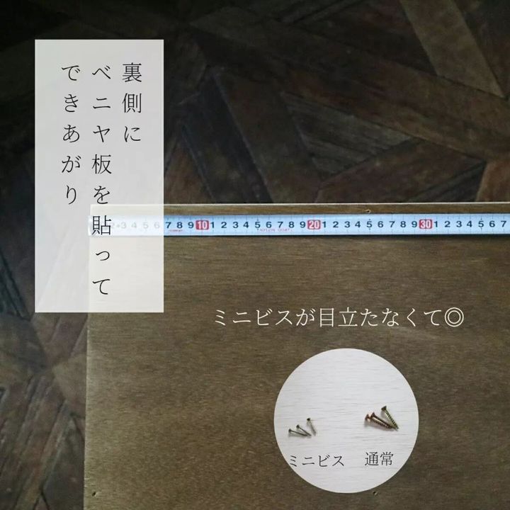 裏面にベニヤ板を貼っていきます。今回は厚さ4㎜のものを使用しました。ミニビスと呼ばれる細目のビスで固定します。後ろから見たときに目立たず、仕上がりがきれいになりますよ。ベニヤ板を貼って少しはみ出た場合は、ノコギリで切るなど、微調整をしてください。最後にお好みで色を塗ってできあがり。
