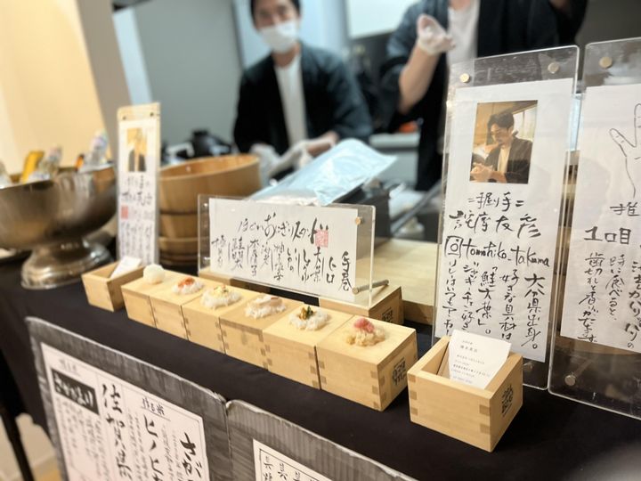 その日の具材を升に乗せ、お品書きとともにディスプレイしてくれる粋な演出も。手書きのメニュー表も日本らしくって、いいでしょう? 海外ゲストにもわかりやすいのが嬉しい。