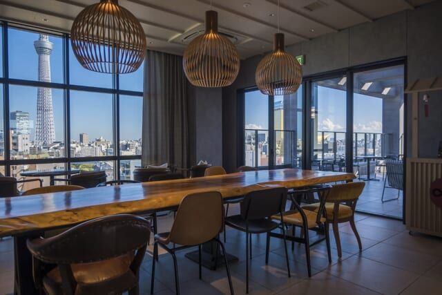 浅草寺ビューを楽しめる最上階のOMOベース。反対側には東京スカイツリーも見られ、浅草屈指の風景を楽しめます。