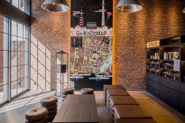 OMOブランドのホテルには、宿泊者なら誰でも利用できるカフェ兼ラウンジの「OMOベース」を用意。壁に架かる大きな「ご近所マップ」には、スタッフが集めた周辺の飲食店情報が記されるほか、大きな窓からは浅草寺境内の五重塔や観音堂(本堂)の大屋根など、絶景が見られます。