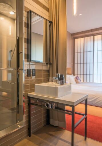 寄席ツインルームはバスタブのない、レインシャワー付きのシャワーブースを備えます。洗面の鏡は可動式で、窓からの景色を見たいときは写真のように壁側にたたみ、使う時は開きます。
