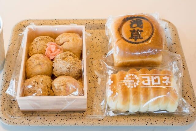 ▲福寿家の伊奈利寿司とケーキショップテラサワのコロネ、パン工房クラージュの「浅草あんぱん」
