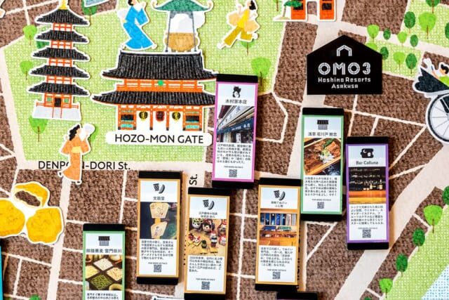 OMO3浅草の「ご近所マップ」は1階と13階に2種類あって、1階のテーマは「今が楽しい歳時記マップ」。ホテルのスタッフが日々浅草を歩いて、ご近所さんから教えてもらった情報をもとに、季節のおすすめの食べ物やお店などを掲載。浅草は道が複雑ですが、QRコードを読み込めばお店までのルートが判ります。お土産選びや食事の参考になりますよ。