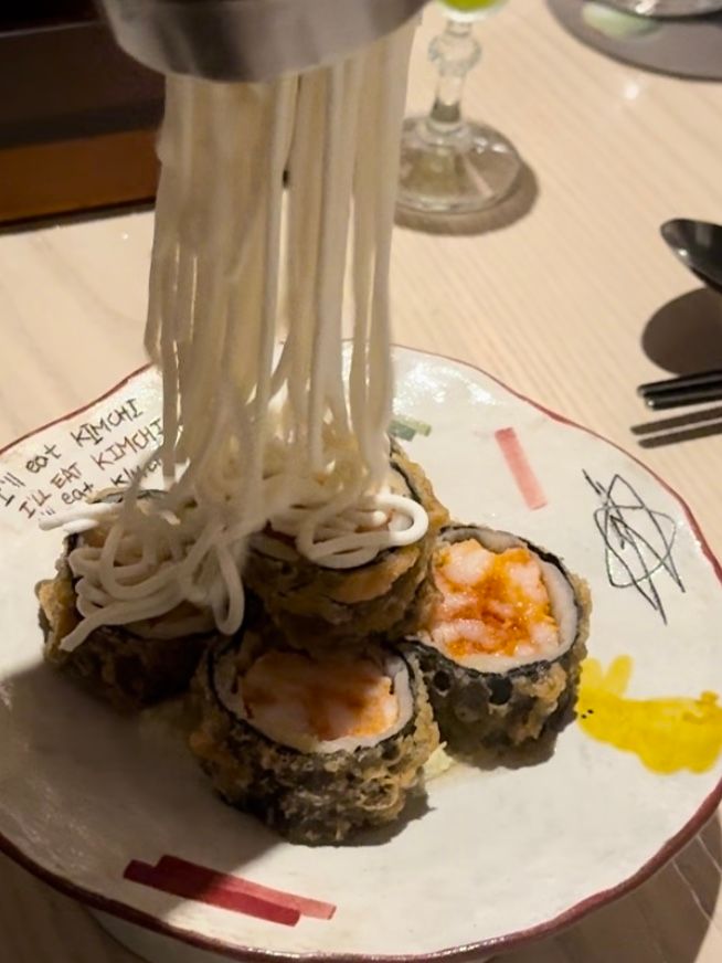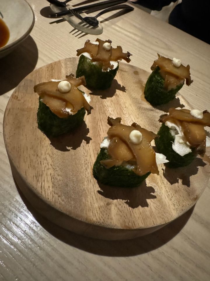 そして、お次に運ばれてきたのがオーダー料理その2:アワビの醤油漬けキンパ。こちらもなんというおしゃれなな佇まい! もちろん中にはキムチを合わせたごはんがIN。この小さなひとつひとつが、まさに宇宙。