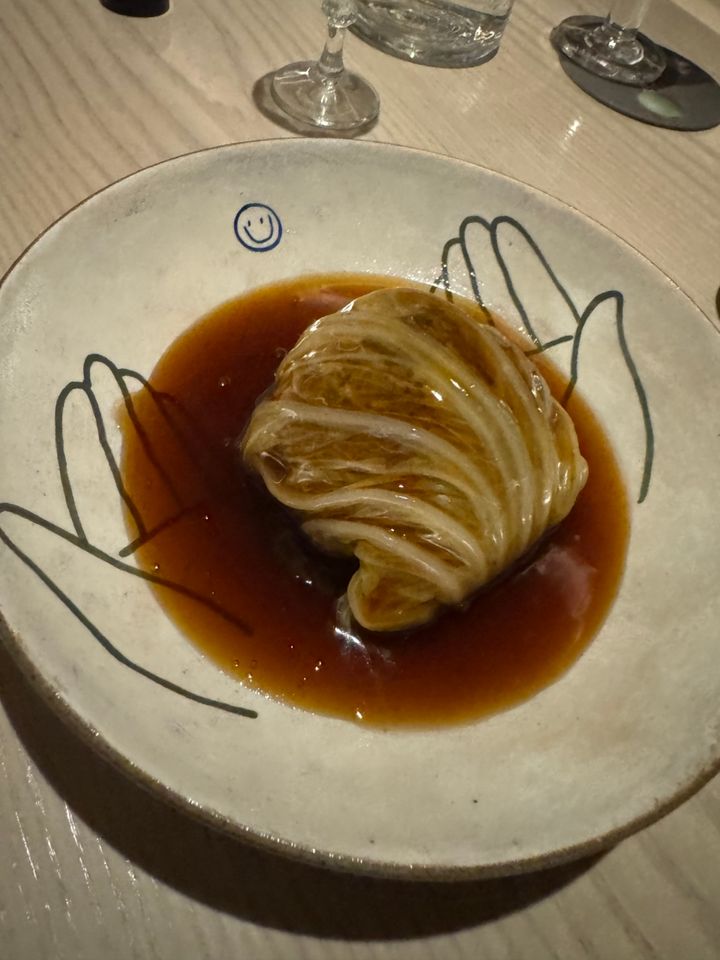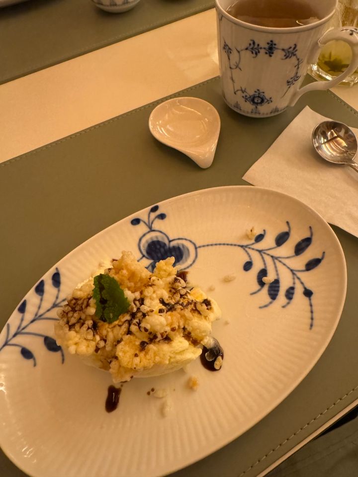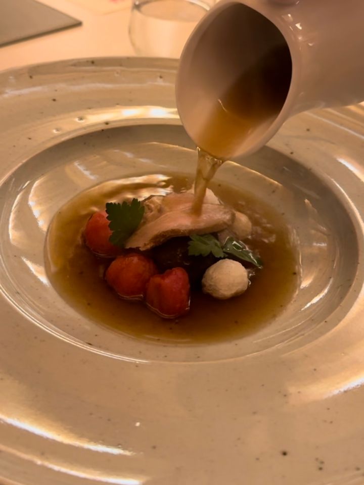 続く温菜。サクサクもっちもちなじゃがいも団子、焼いたチェリートマト、肉厚なキノコ、そしてふわふわのローストダックが重ねられた器に、温かなコンソメスープが目の前で注がれます。この一つ一つどの食材も素晴らしく美味しくて、出汁がしっかり効いたコンソメスープも、口の中をめいっぱい幸せにしてくれました🥹 この白くて丸いものが完全にトック(お餅)だと思っていたら、じゃがいものお団子でした。
